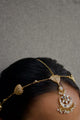 Add a royal touch to your traditional look with this mathapatti. Crafted in a gold finish, it features heart shaped motifs and a centerpiece embellished with mirror polished kundan stones and dainty pearl hangings.